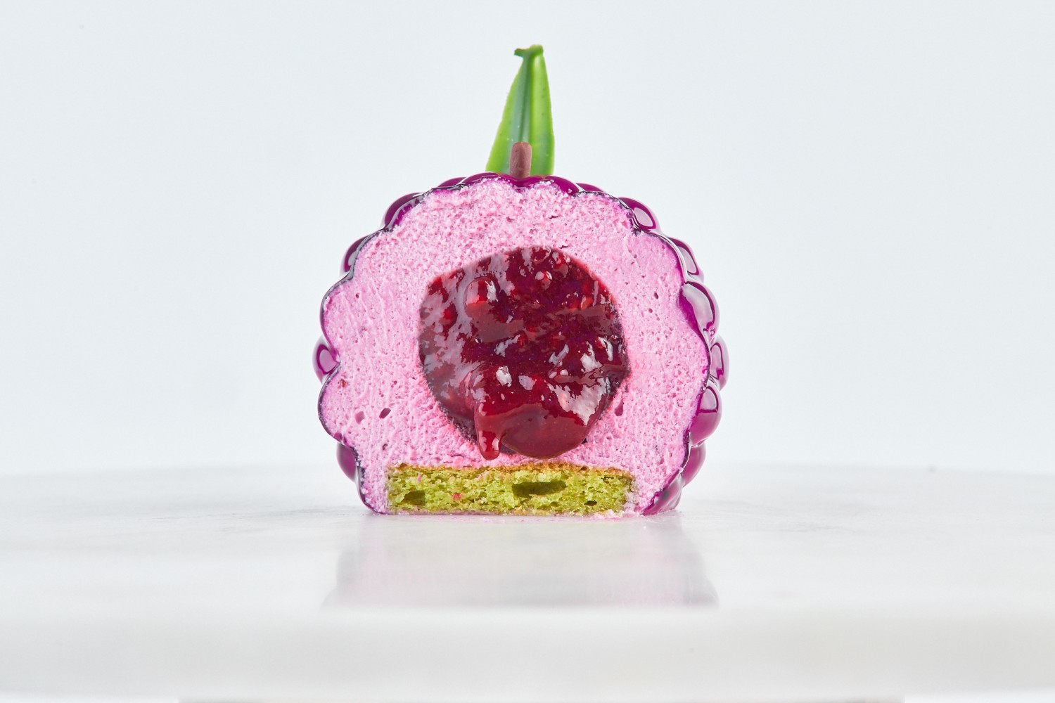 Мусс из черники, малины и мяты с начинкой из ежевики на фисташковом бисквите