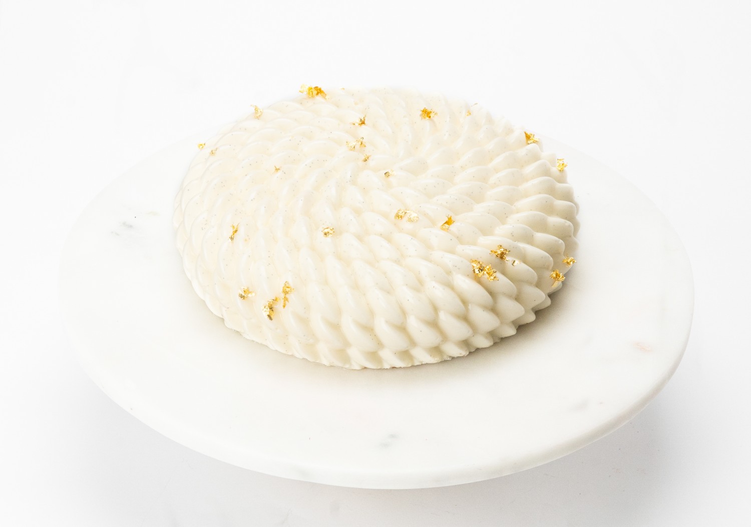 Мусс из мадагаскарской ванили, ореховое пралине и ганаш из бобов тонка на шоколадном бисквите.