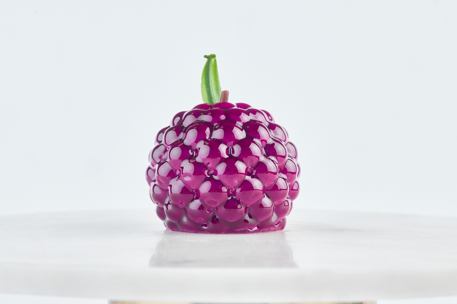 Мусс из черники, малины и мяты с начинкой из ежевики на фисташковом бисквите
