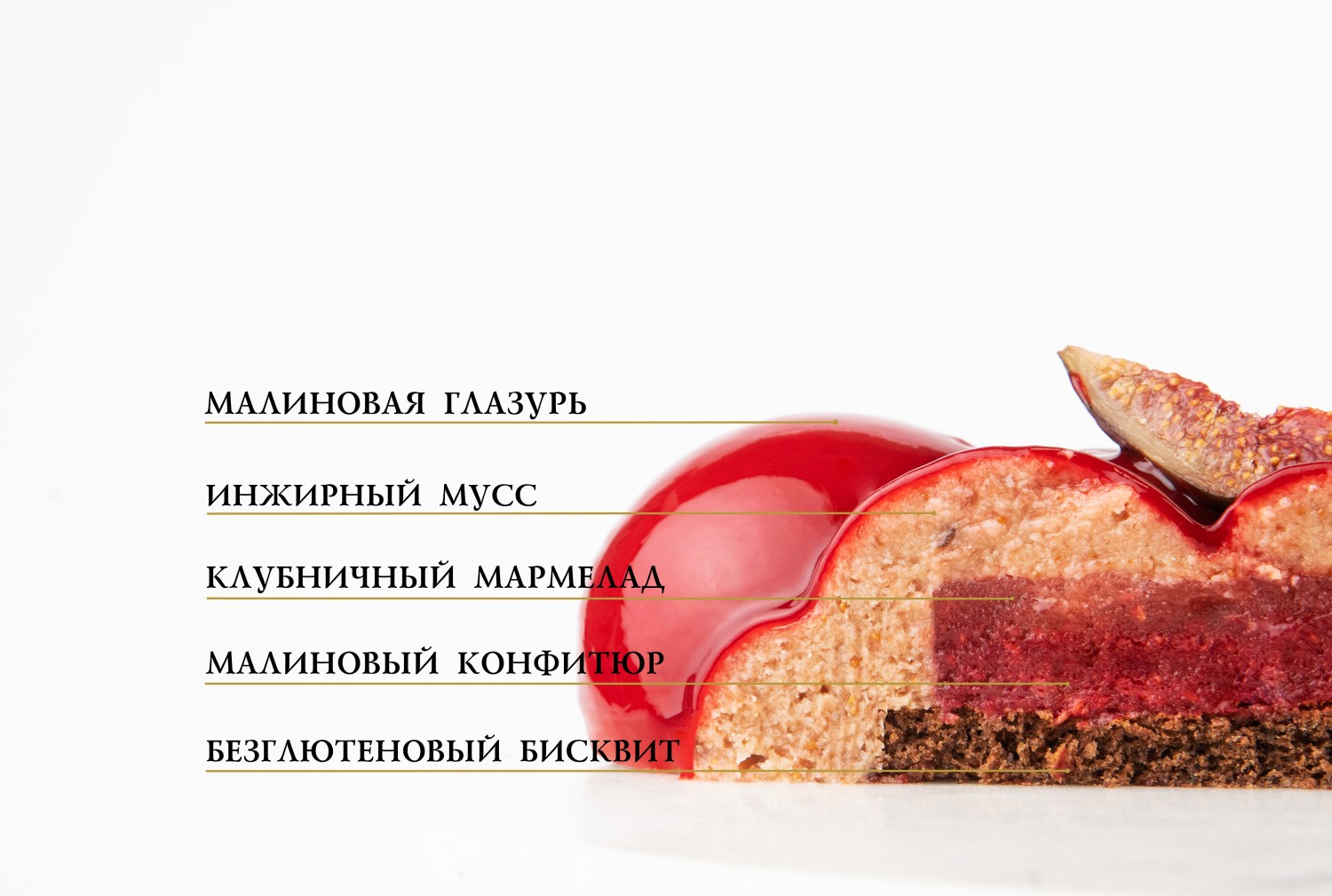 Мусс из инжира, клубничный мармелад и малиновый конфитюр на шоколадном бисквите.