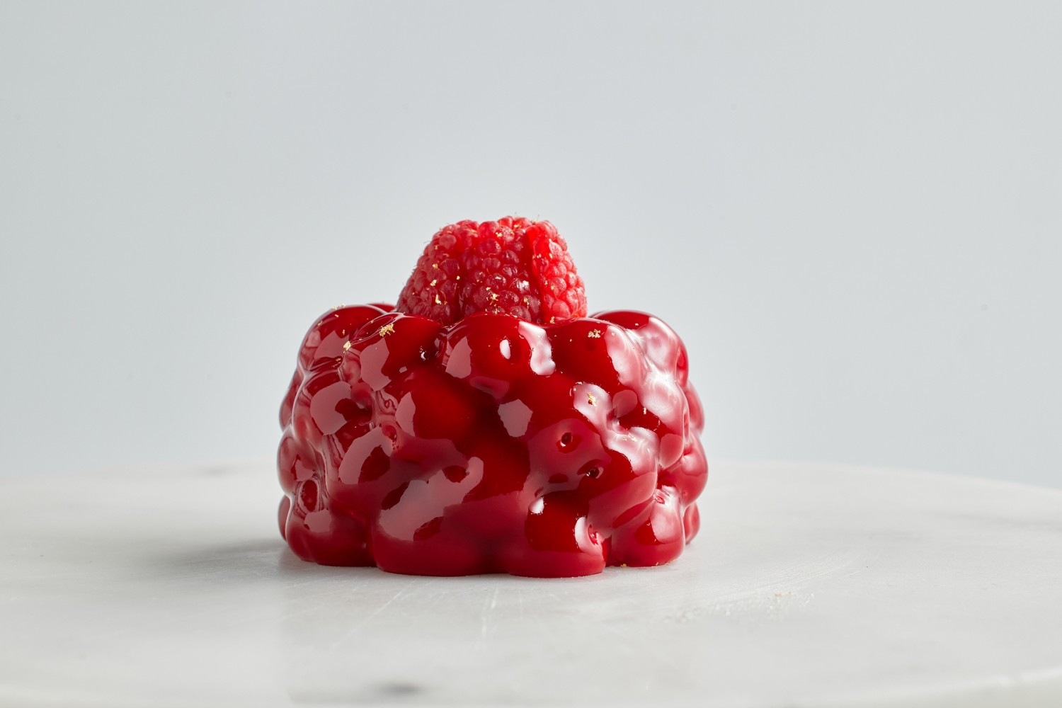 Мусс из малины с начинкой из спелого манго на шоколадном бисквите