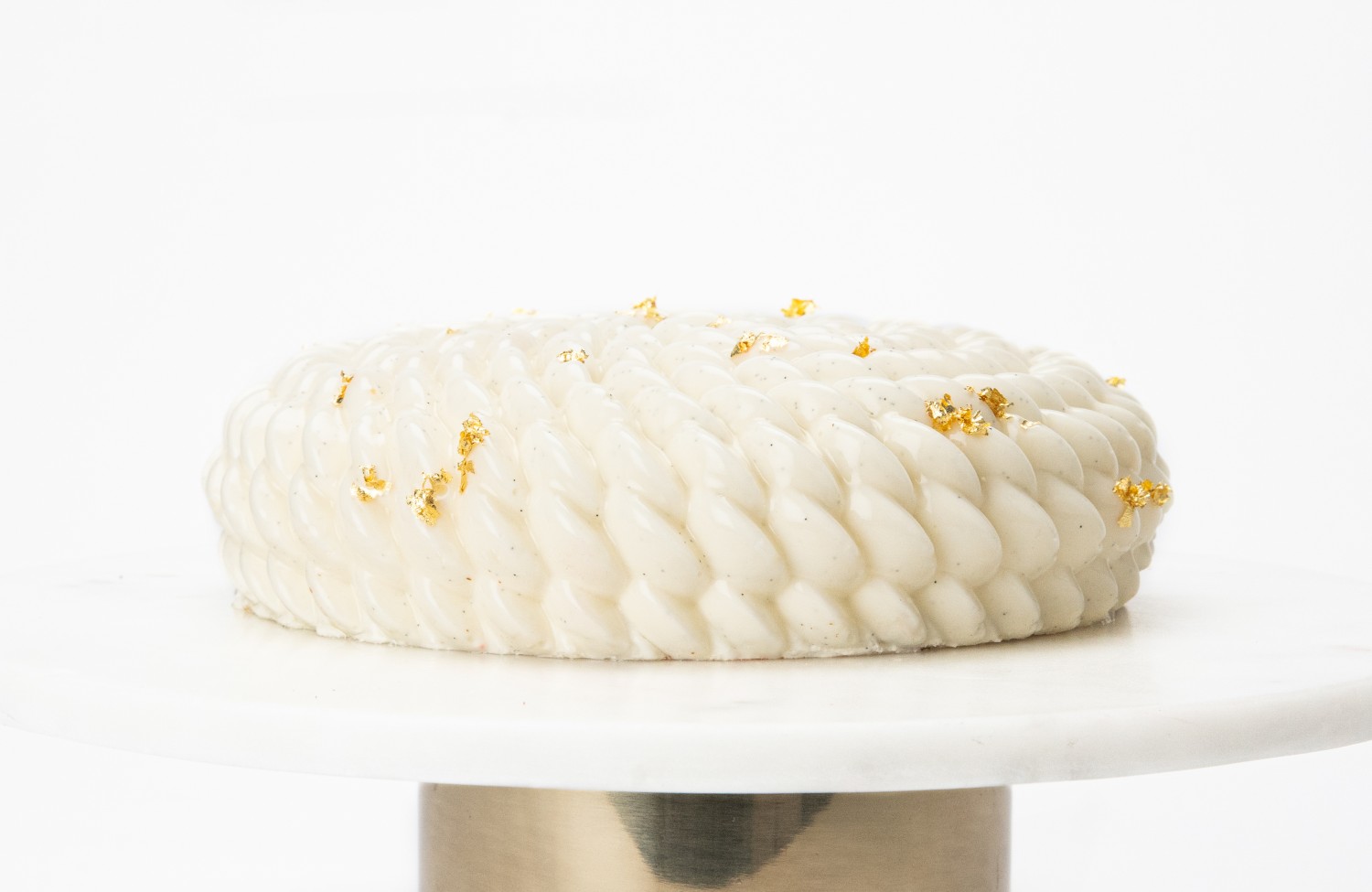 Мусс из мадагаскарской ванили, ореховое пралине и ганаш из бобов тонка на шоколадном бисквите.
